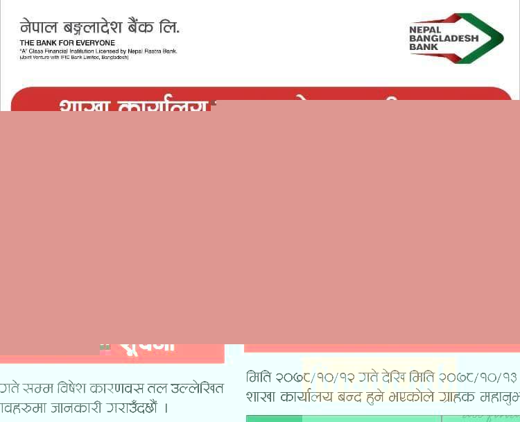 नेपाल बंगलादेश बैंकको माघ १२ र १३ गते निम्न शाखा कार्यालयहरु बन्द रहने सम्बन्धी सूचना