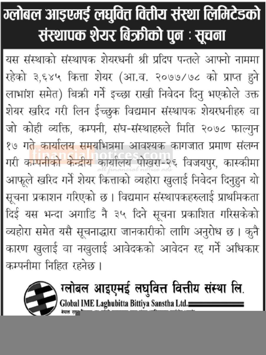 ग्लोबल आइएमई लघुवित्तको संस्थापक शेयर पुनः बिक्रीमा