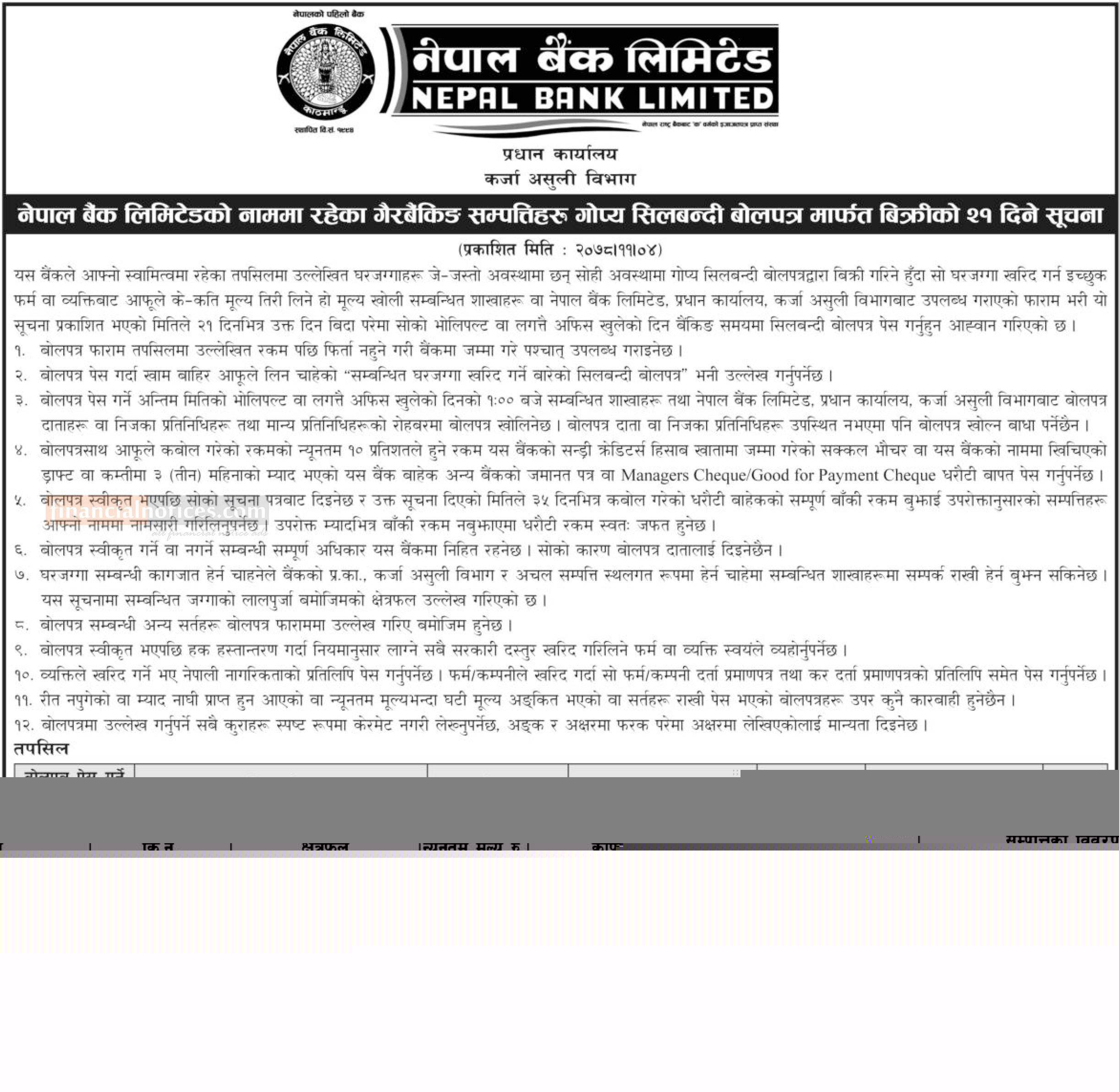 नेपाल बैंकको नाममा रहेको गैरबैंकिङ सम्पत्तिहरु गोप्य सिलबन्दी बोलपत्र मार्फत विक्रिको सूचना