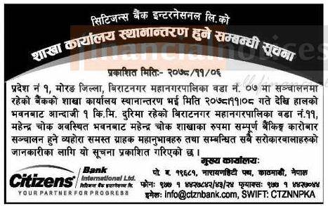 बैंकको शाखा कार्यालय स्थानान्तरण हुनेबारे सूचना