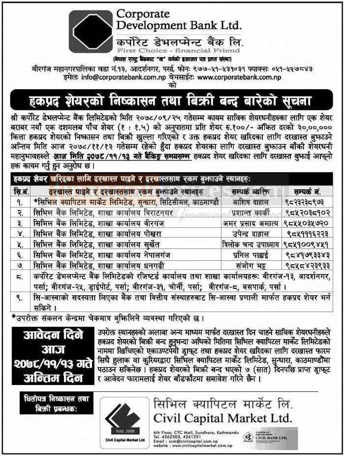 कर्पाेरेट डेभलपमेण्ट बैंकको हकप्रद शेयरमा आवेदन दिने आज अन्तिम दिन