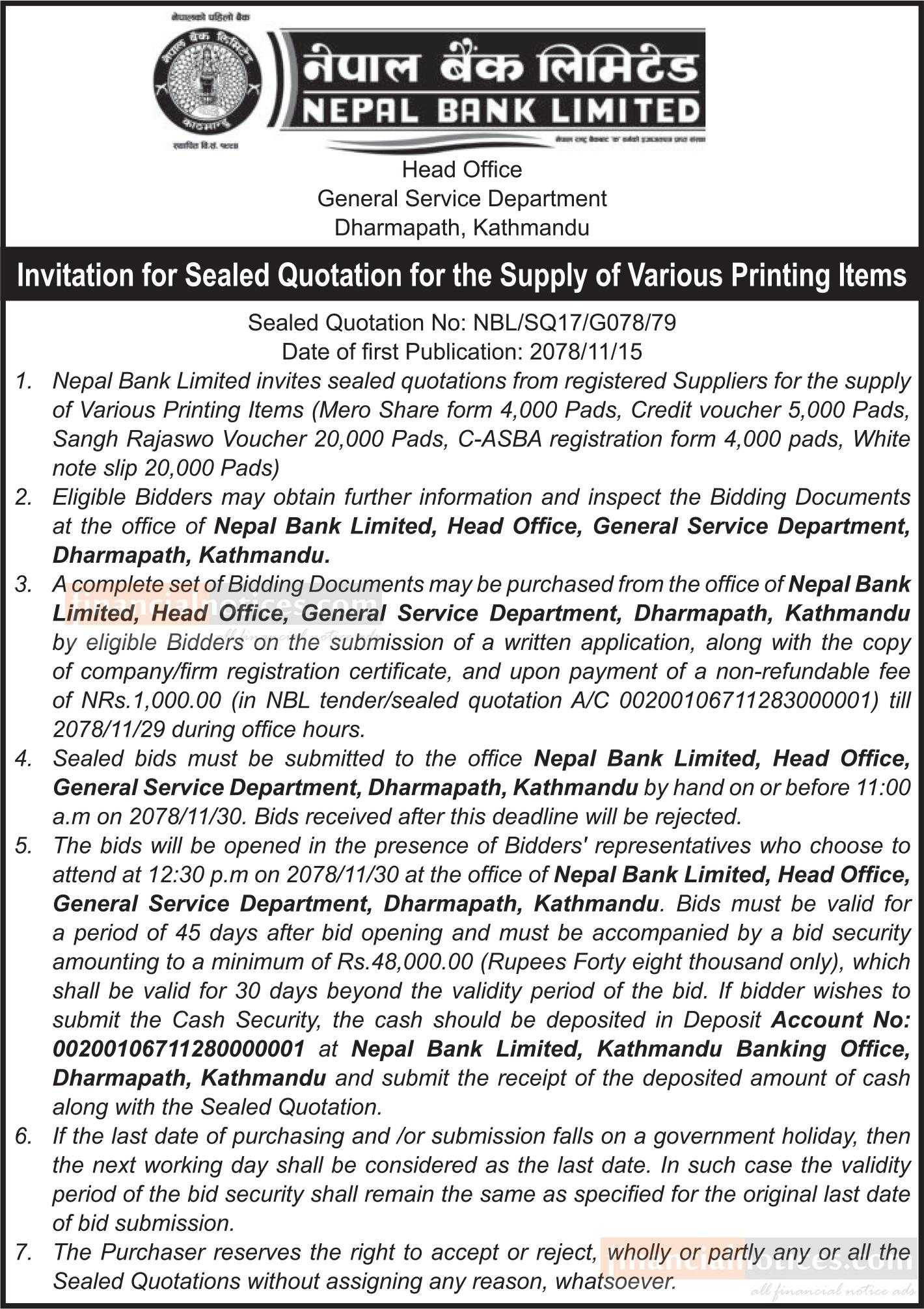 Invitation for Sealed Quotation for the Supply of Various Printing Items