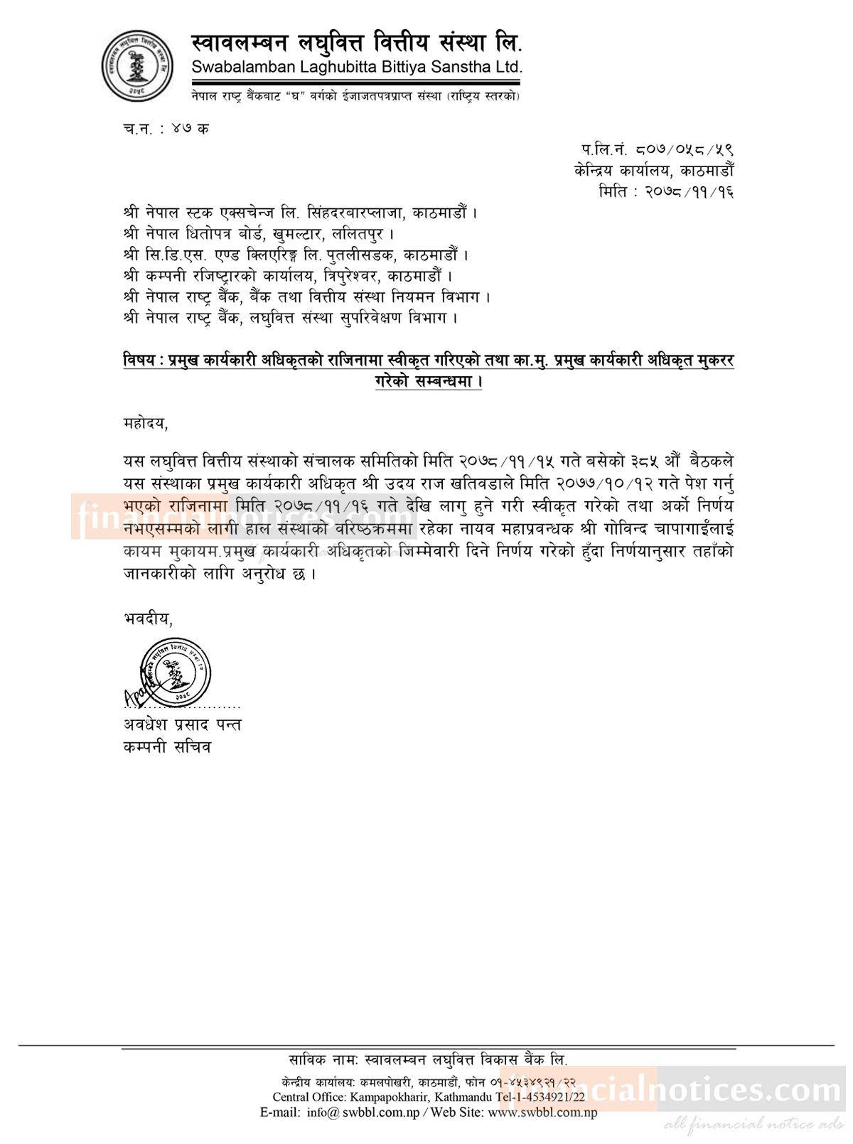 स्वावलम्बन लघुवित्तको प्रमुख कार्यकारी अधिकृतको राजिनामा स्वीकृत गरिएको सूचना