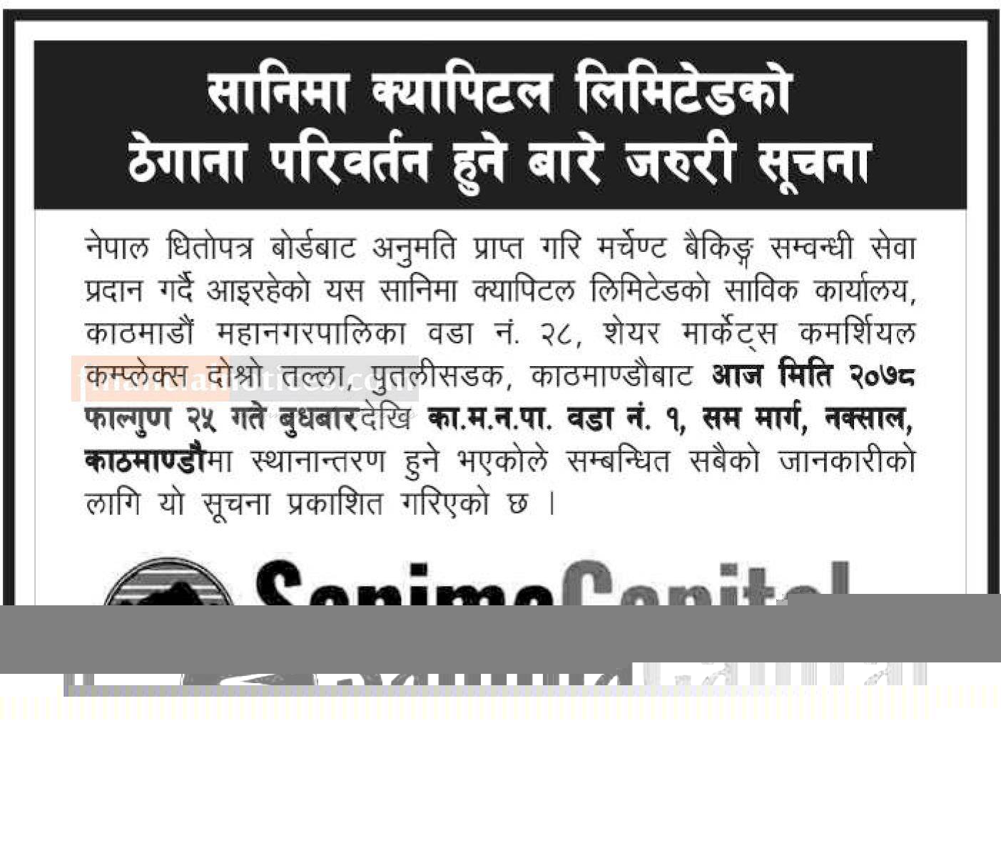 सानिमा क्यापिटलको ठेगाना परिवर्तन हुने बारे सूचना