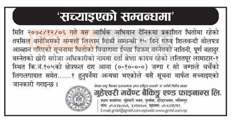 Kumari Bank Auction Notice for Non-Banking Assets at Mahendranagar, Kanchanpur -