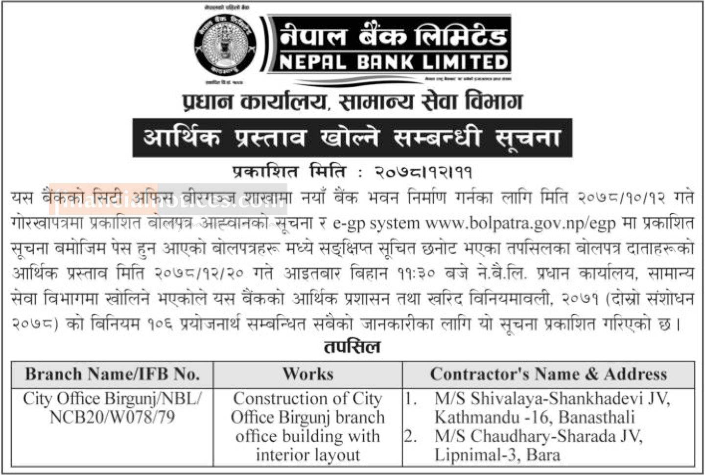 आर्थिक प्रस्ताव खोल्ने सम्बन्धी सूचना