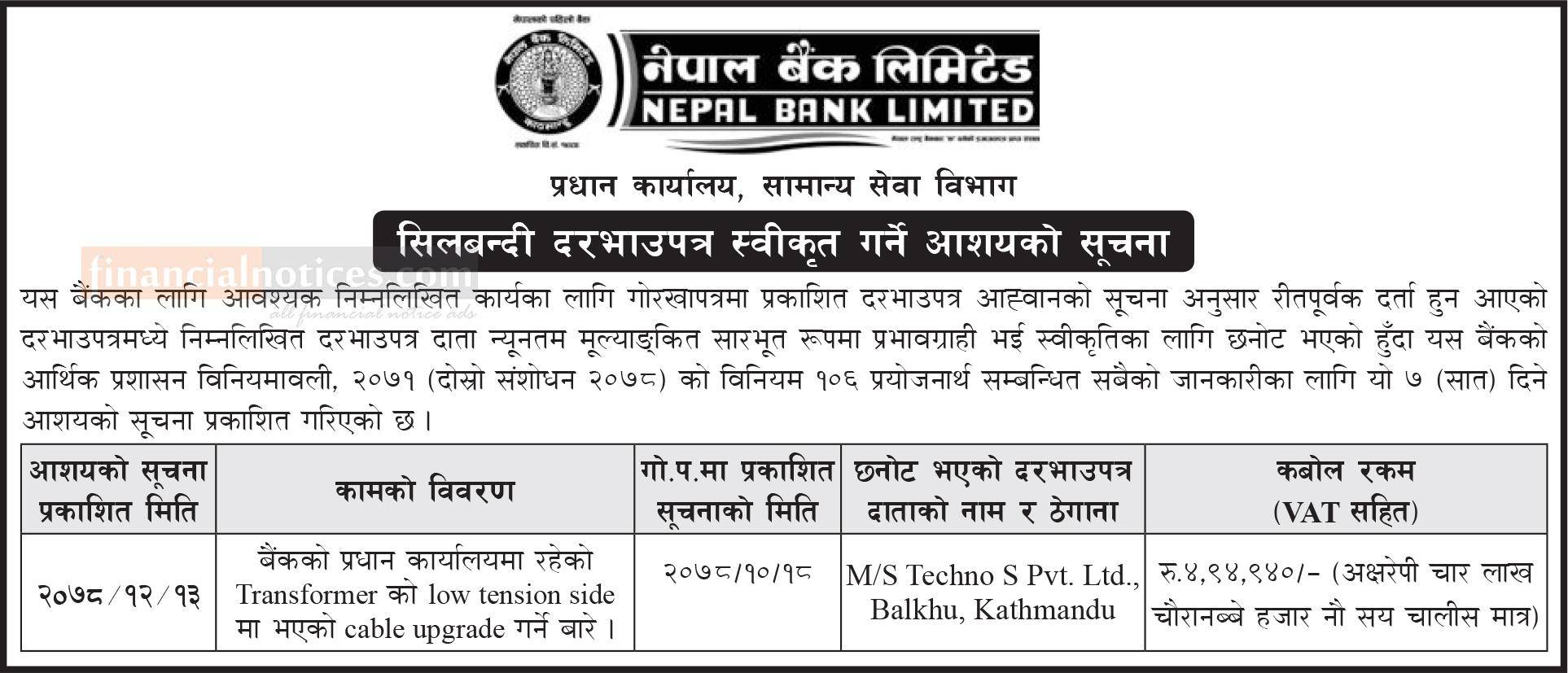 सिलबन्दी दरभाउपत्र स्वीकृत गर्ने आशयको सूचना