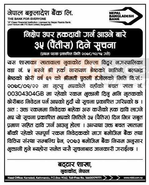 निक्षेप उपर हकदावी गर्न आउने बारे ३५ दिने सूचना