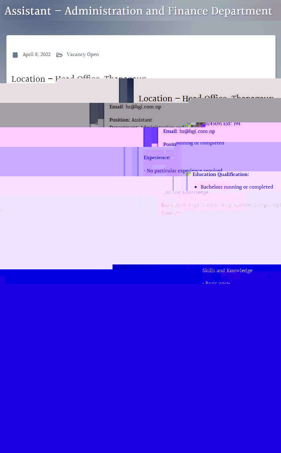 Vacancy Announcement (Assistant – Administration and Finance Department)
