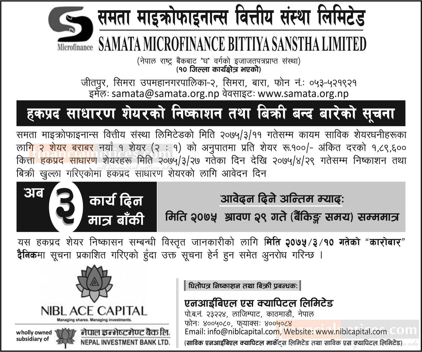 हकप्रद शेयरको आवेदन दिने अन्तिम म्याद