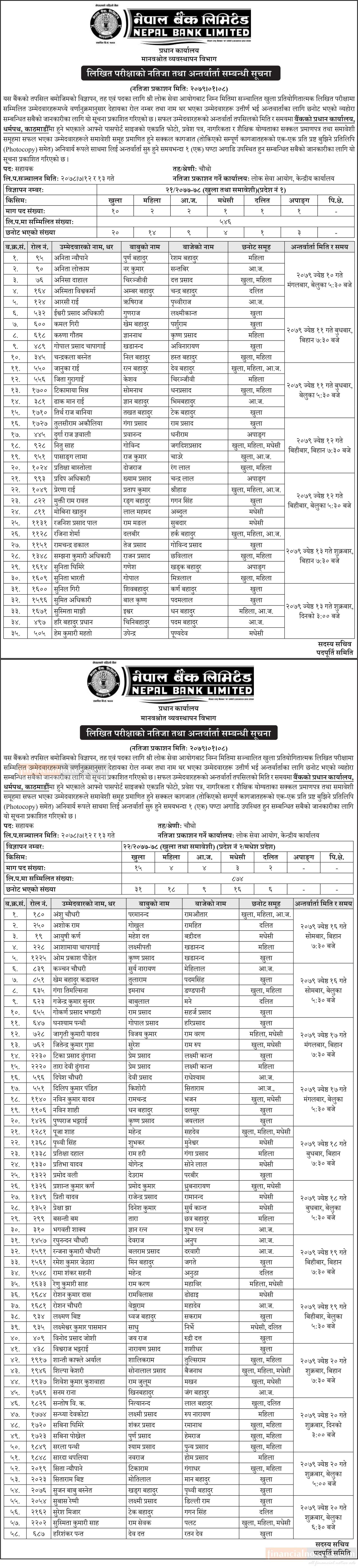 नेपाल बैंकको लिखित परीक्षाको नतिजा तथा अन्तर्वार्ता सम्बन्धी सूचना