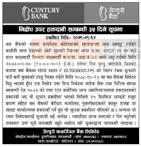 निक्षेपउपर हकदावी गर्ने सम्बन्धी ३५ दिने सूचना
