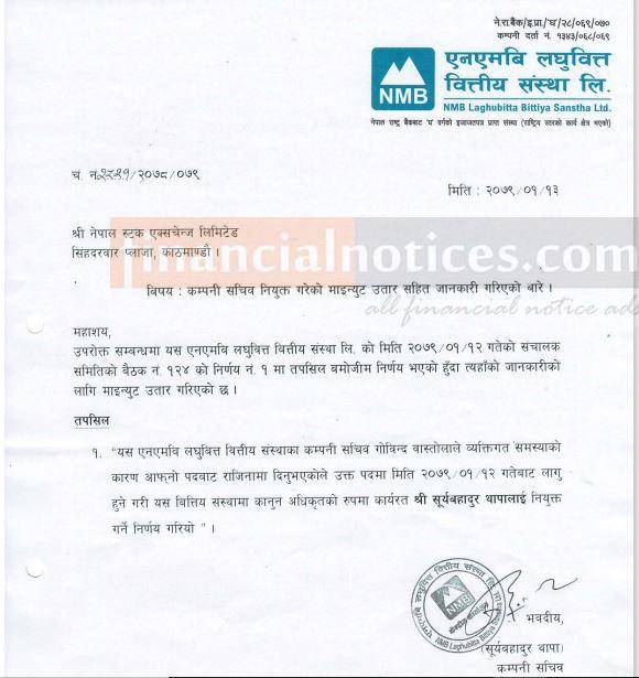 एनएमबि लघुवित्तको सचिव नियुक्ति बारे सूचना