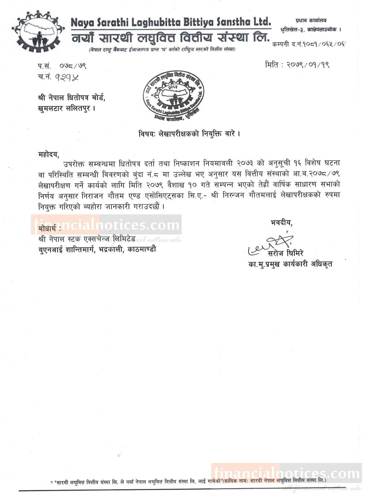 नयाँ सारथी लघुवित्तको लेखापरिक्षक नियुक्ति सम्बन्धी सूचना