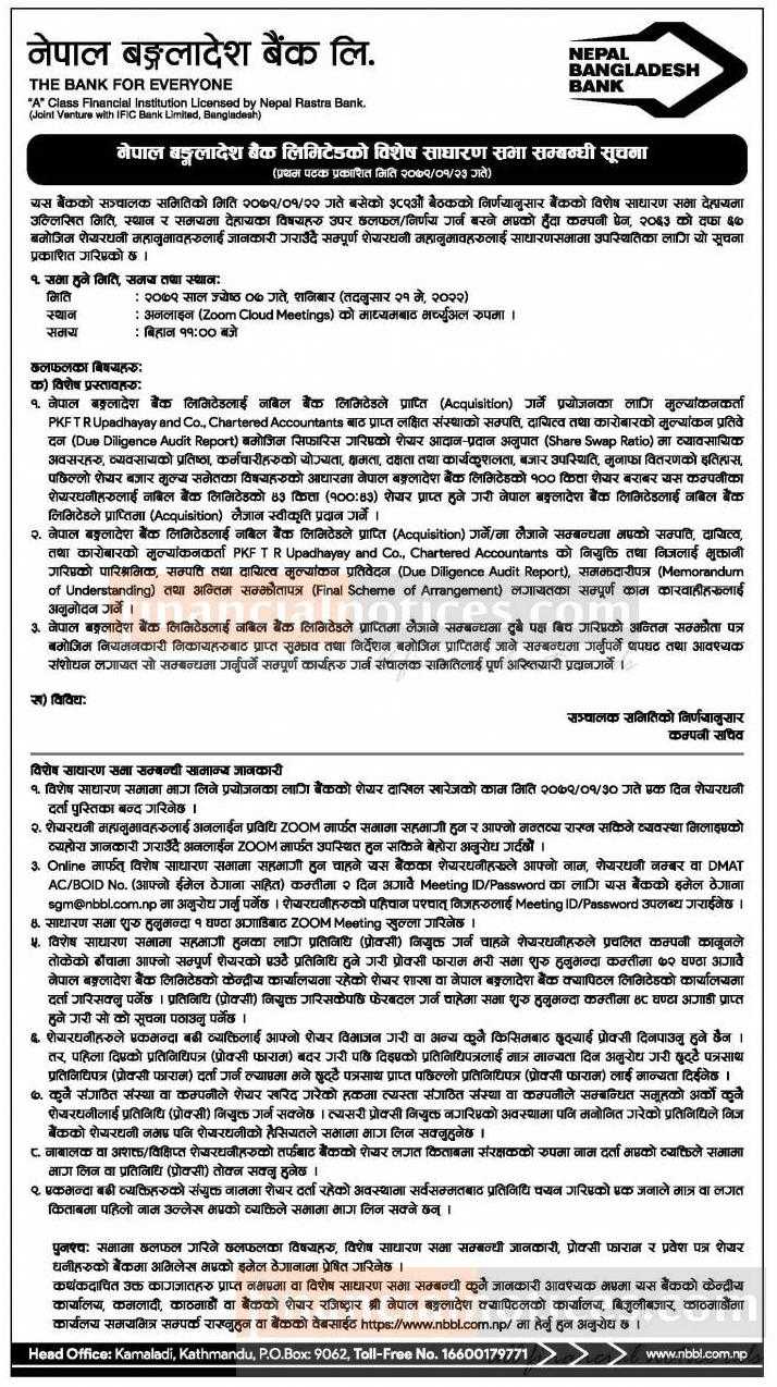 नेपाल बंगलादेश बैंकको विशेष साधारण सभा सम्बन्धी सूचना -