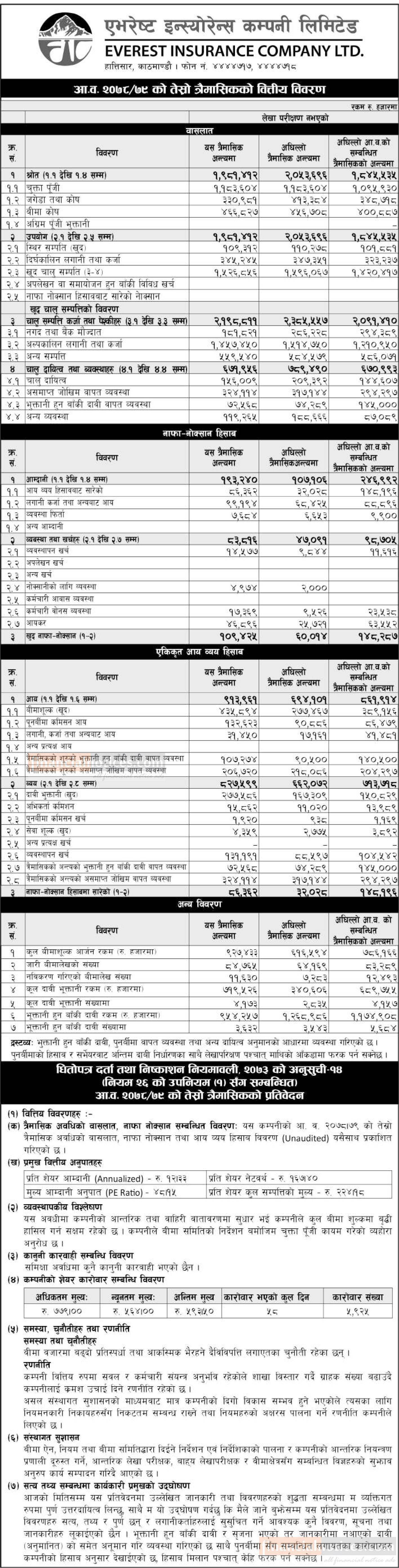 Everest Insurance has posted a net profit of Rs 109.42 million during 3rd quarter