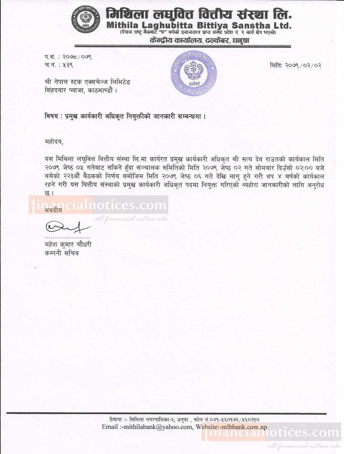 मिथिला लघुवित्तको CEO नियुक्ति सम्बन्धी सूचना