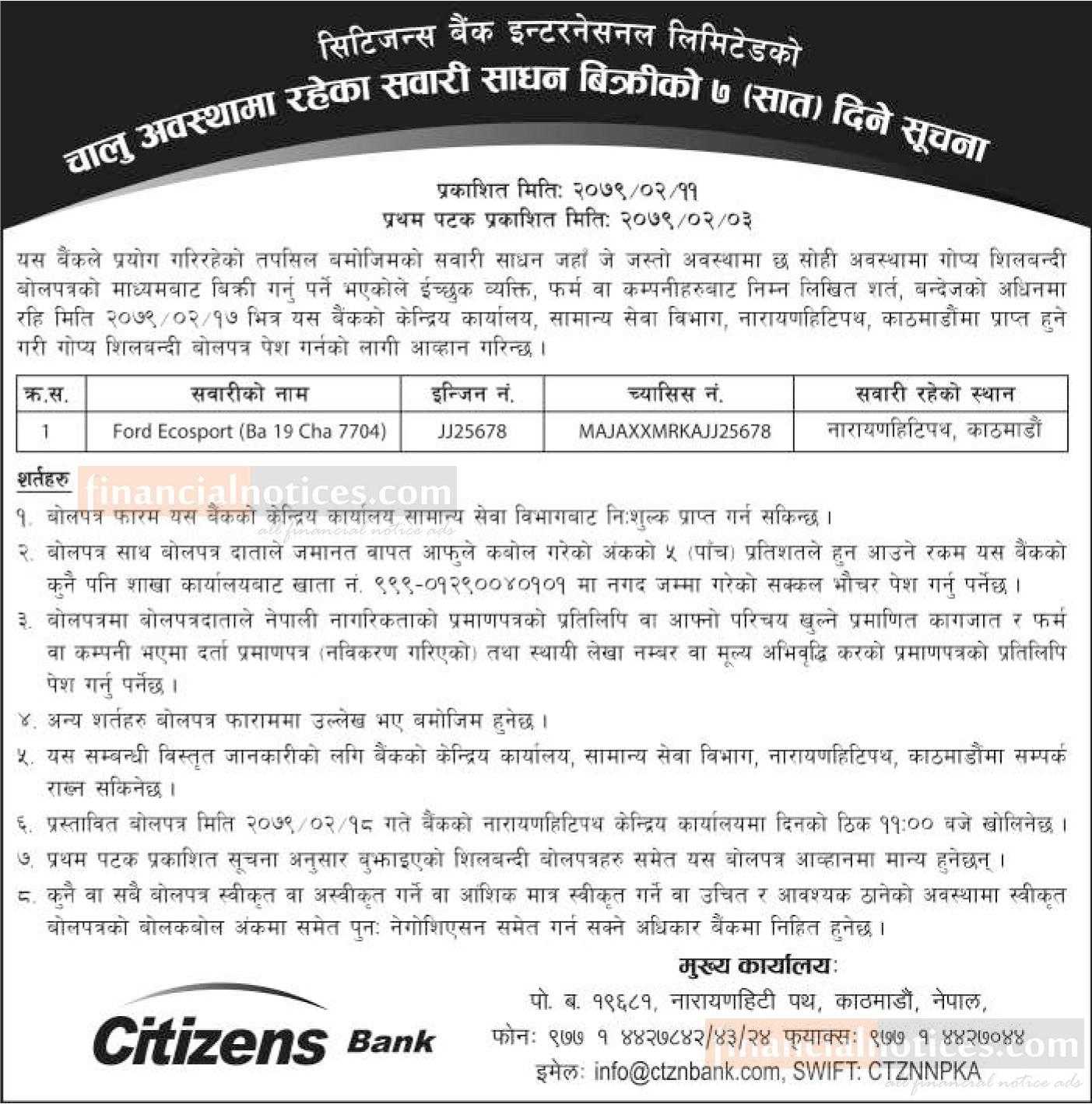 बैंकको चालु अवस्थामा रहेको सवारी साधन बिक्रीको ७ दिने सूचना