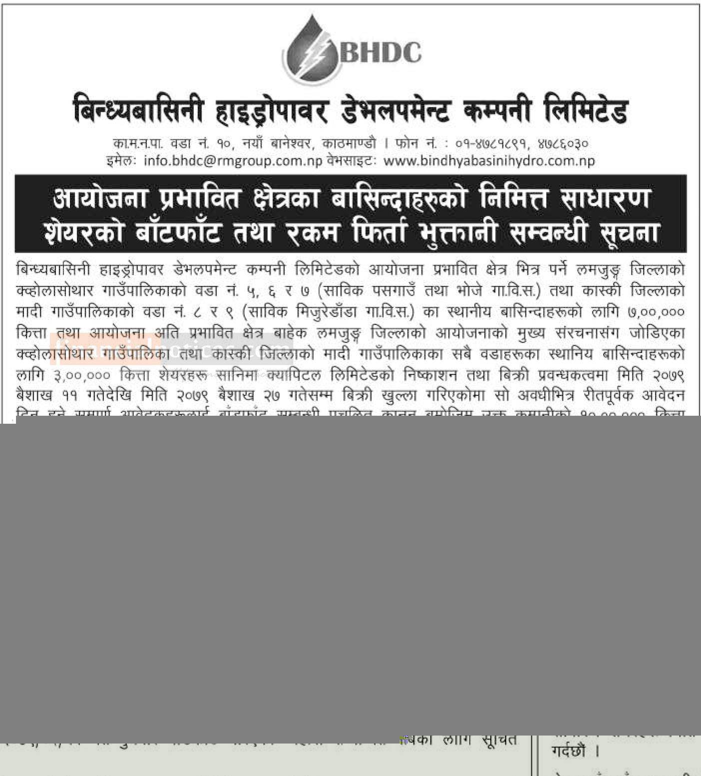 बिन्ध्यबासिनी हाइड्रोपावरको साधारण शेयरको बाँडफाँट तथा रकम फिर्ता भुक्तानीको सूचना