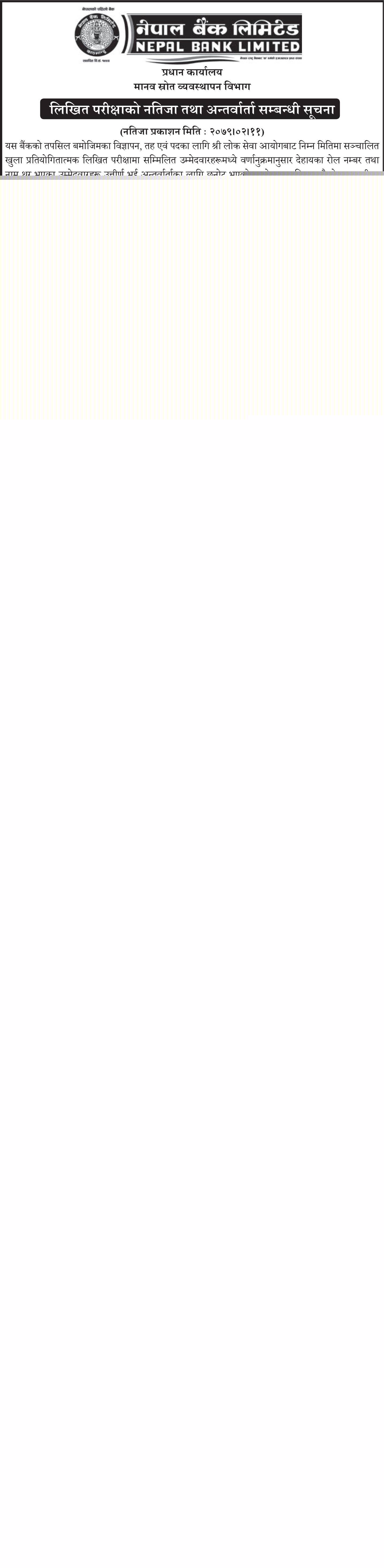 नेपाल बैंकको लिखित परीक्षाको नतिजा तथा अन्तर्वार्ता सम्बन्धी सूचना