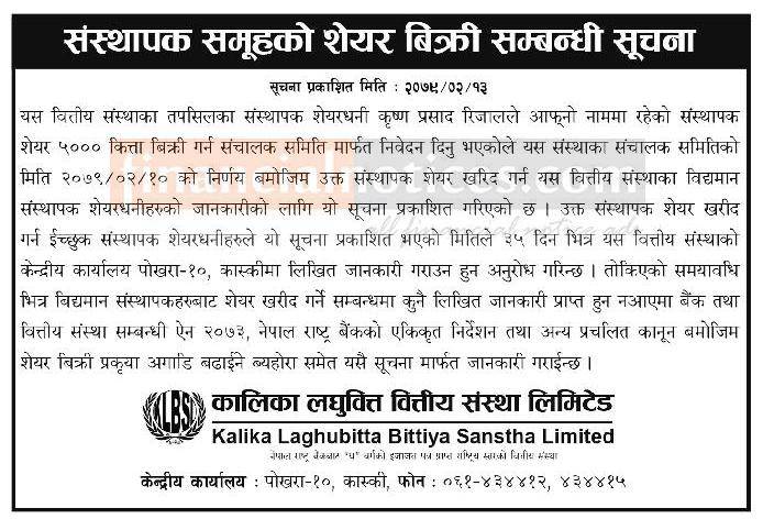 कालिका लघुवित्तको संस्थापक समूहको शेयर बिक्री सम्बन्धी सूचना