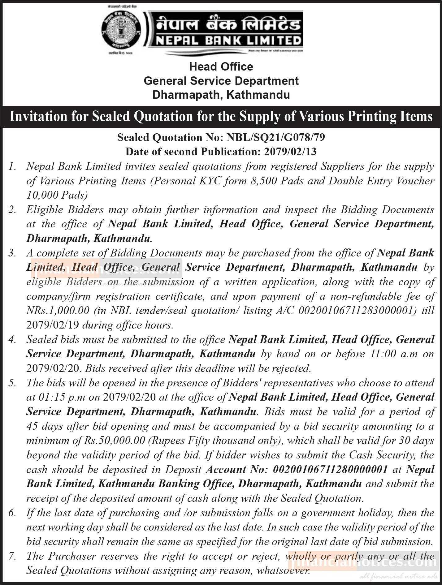 Invitation for Sealed Quotation for the Supply of Various Printing Items