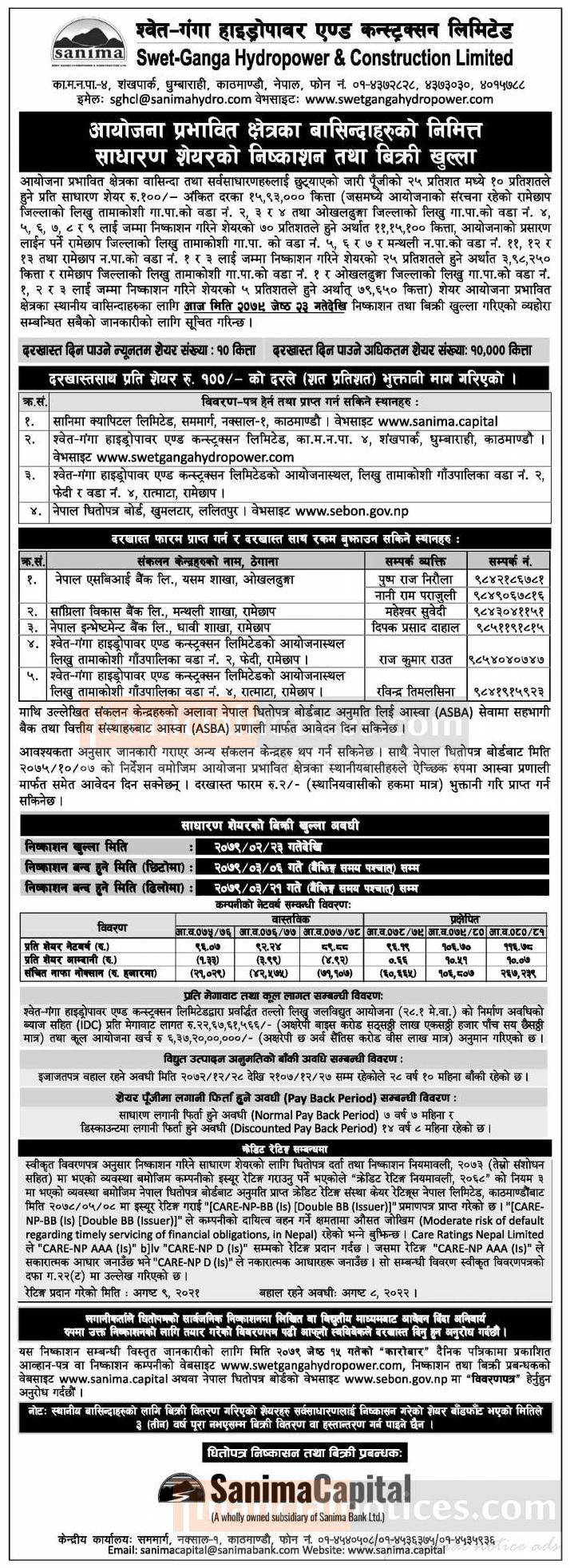 श्वेत गंगा हाइड्रोपावरको आईपीओमा आजदेखि आवेदन दिन सकिनेबारे सूचना