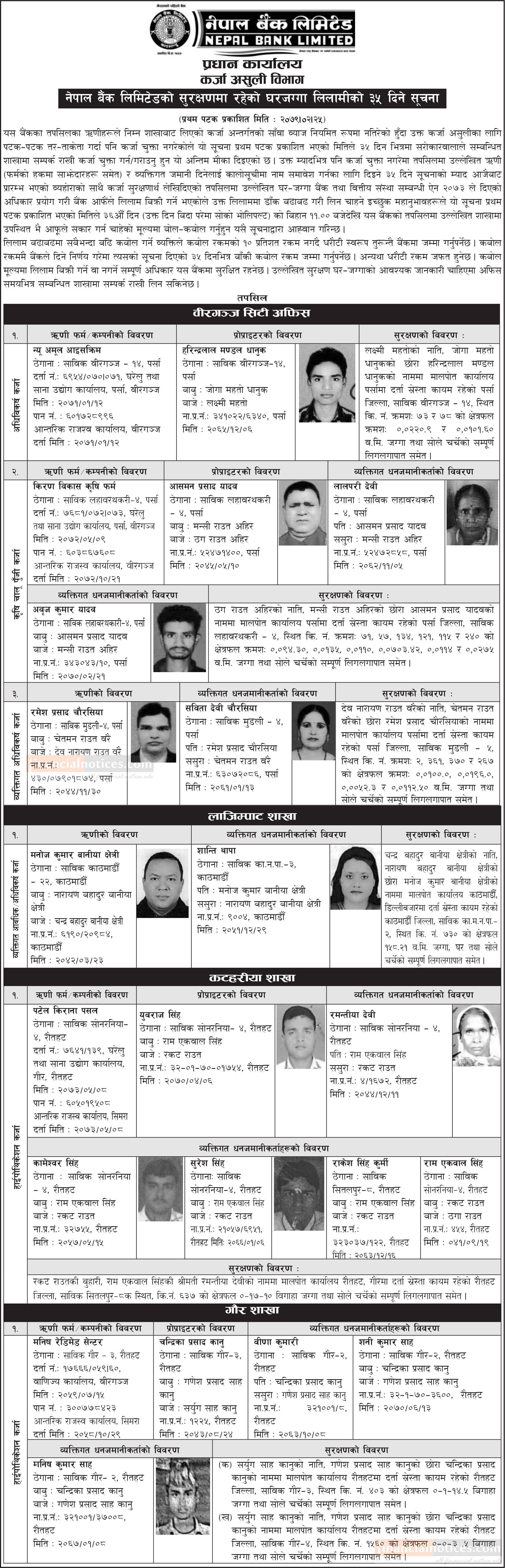 नेपाल बैंकको सुरक्षणमा रहेको घरजग्गा लिलामीको ३५ दिने सूचना