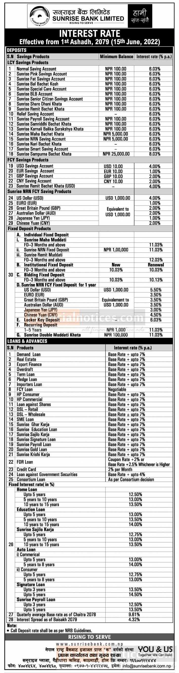 सन्राइज बैंकको नयाँ ब्याजदर सार्वजनिक सम्बन्धी सूचना