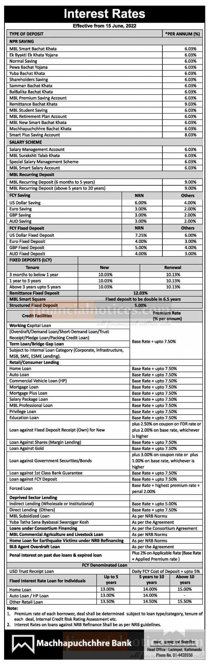 माछापुच्छ्रे बैंकको ब्याजदर परिवर्तनको सूचना - Interest Rates - 2079-1-31