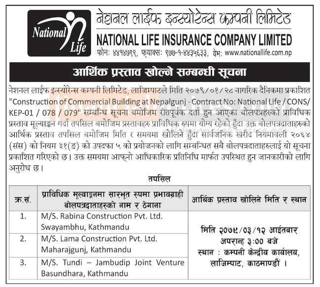 नेशनल लाईफ इन्स्योरेन्सको आर्थिक प्रस्ताव खोल्ने सम्बन्धी सूचना