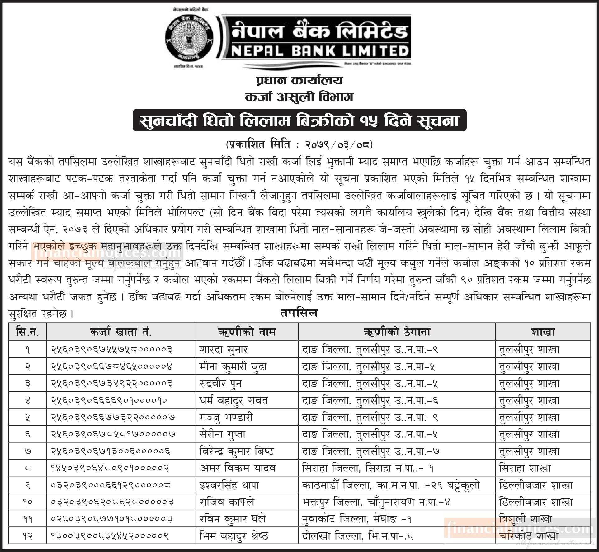नेपाल बैंकको सुनचाँदी लिलाम बिक्रीको १५ दिने सूचना