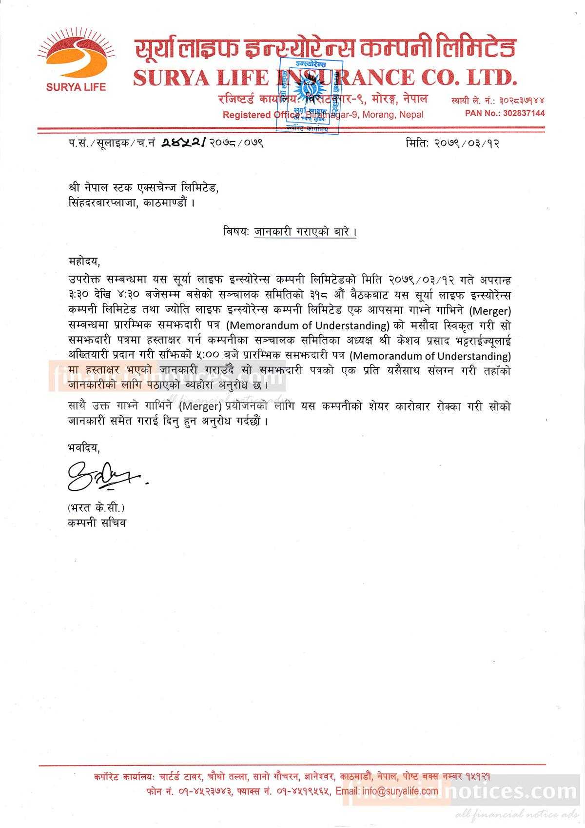 सूर्या लाइफ इस्योरेन्सको शेयर कारोबार रोक्का गर्ने बारे सूचना