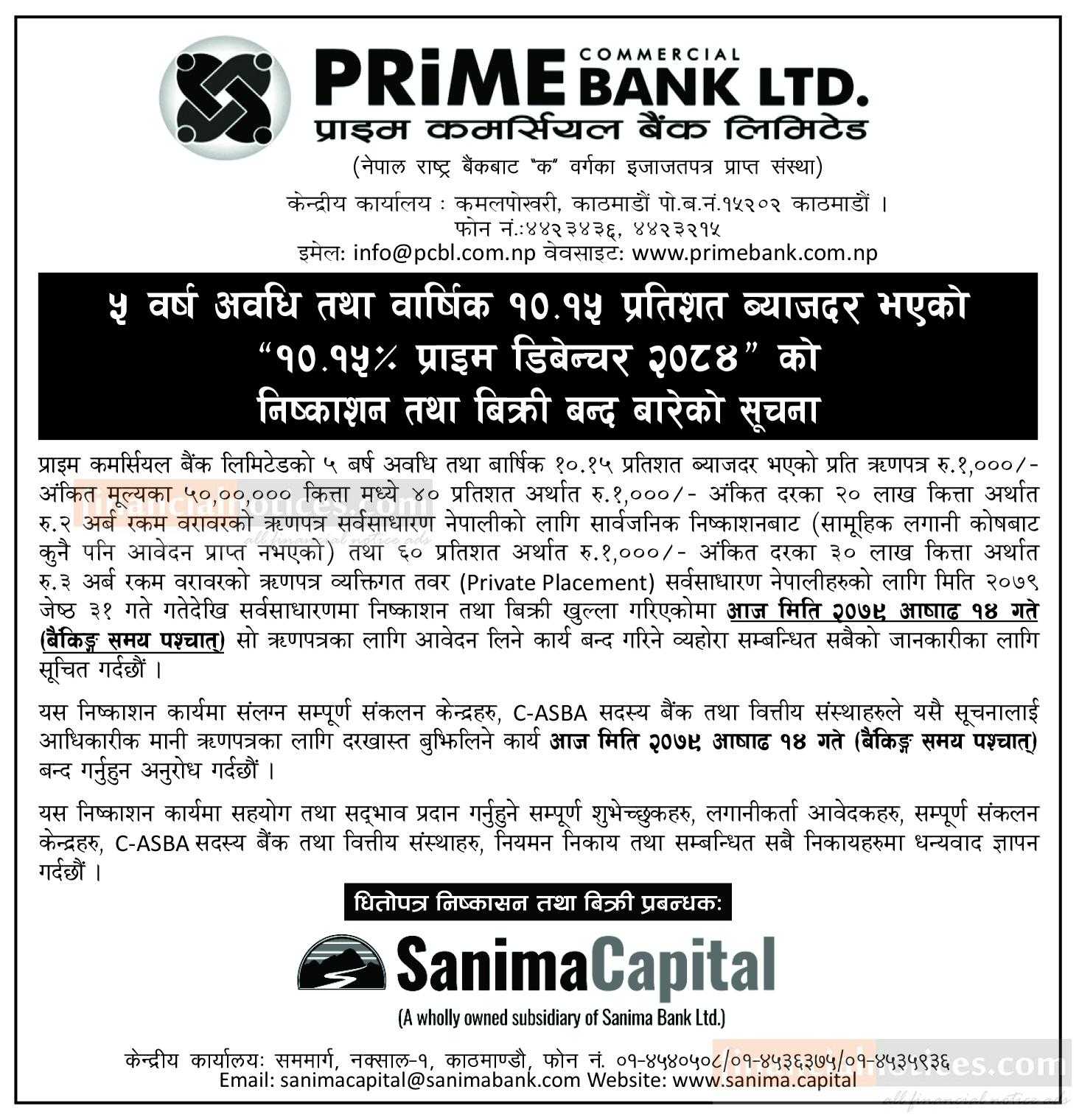५ वर्ष अवधि तथा वार्षिक १०.१५ प्रतिशत ब्याजदर भएको प्राइम डिबेन्चरको बिक्री बन्द बारेको सूचना