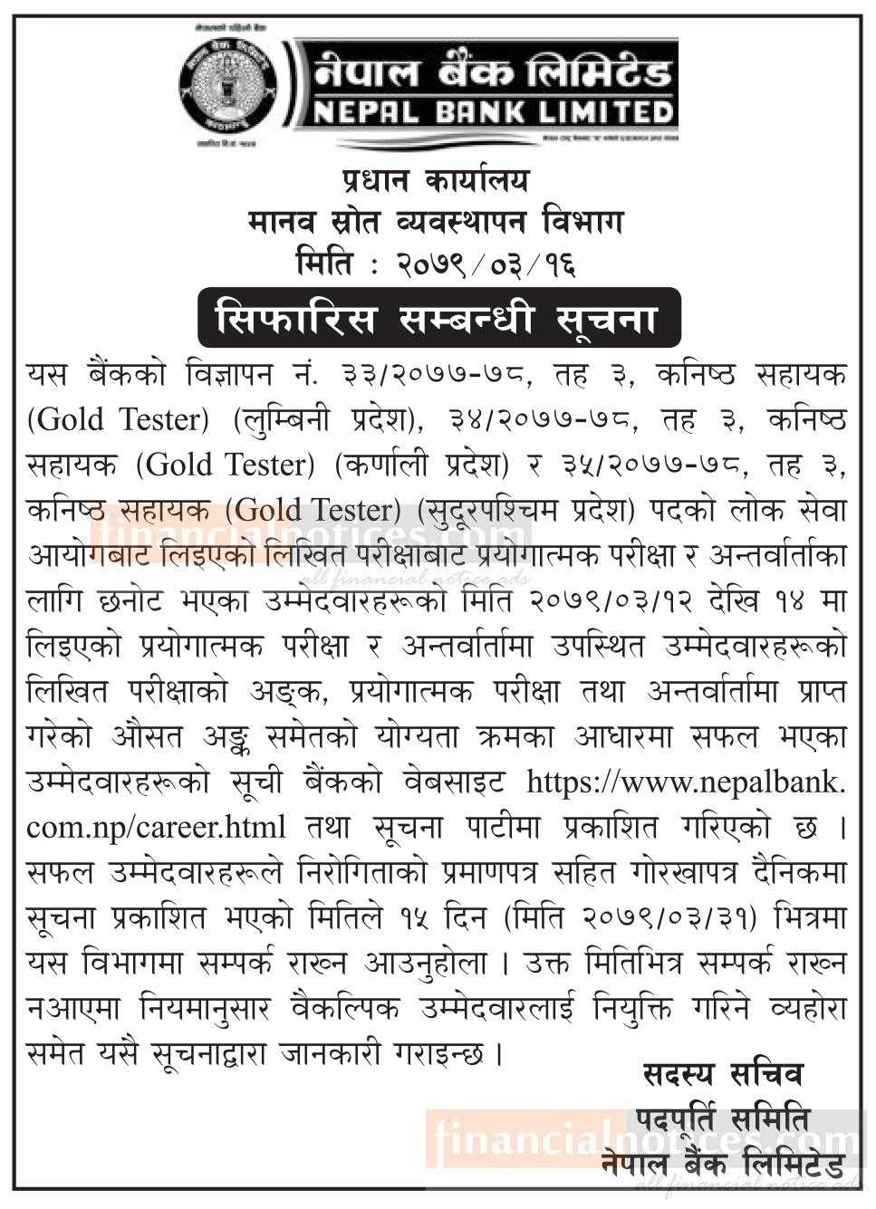 नेपाल बैंकको सिफारिस सम्बन्धी सूचना