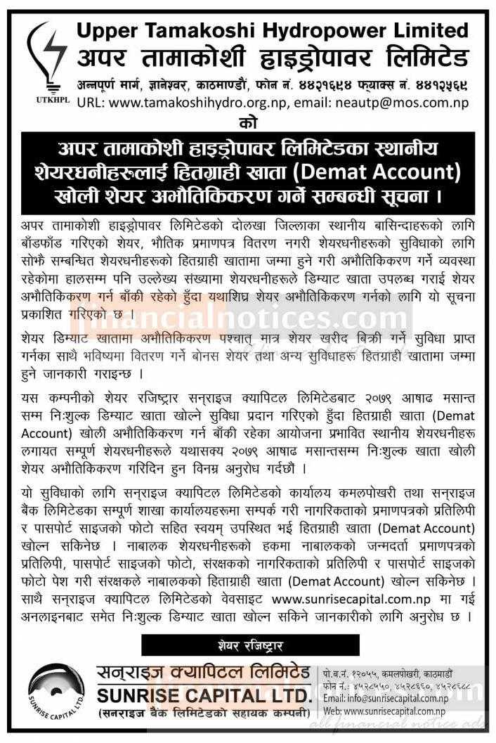अपर तामाकोशीका शेयरधनीहरुलाई हितग्राही खाता खोली शेयर अभौतिकिकरण गर्नेबारे सूचना