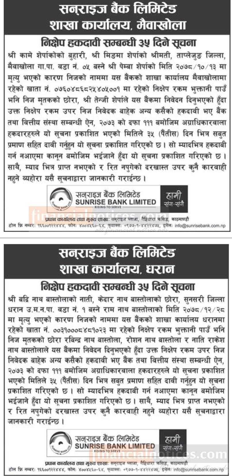 निक्षेप उपर हकदावी सम्बन्धी सनराइज बैंकको सूचना
