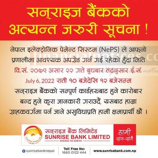 बुधबार राति १० बजेदेखि १२ बजेसम्म सन्राइज बैंकको कार्डहरूबाट हुने सेवाहरु बन्द रहनेबारे सूचना