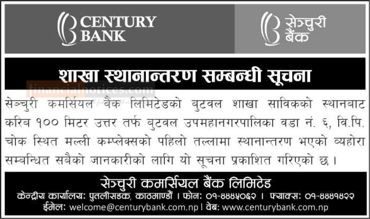 सेञ्चुरी बैंकको शाखा स्थानान्तरण सम्बन्धी सूचना