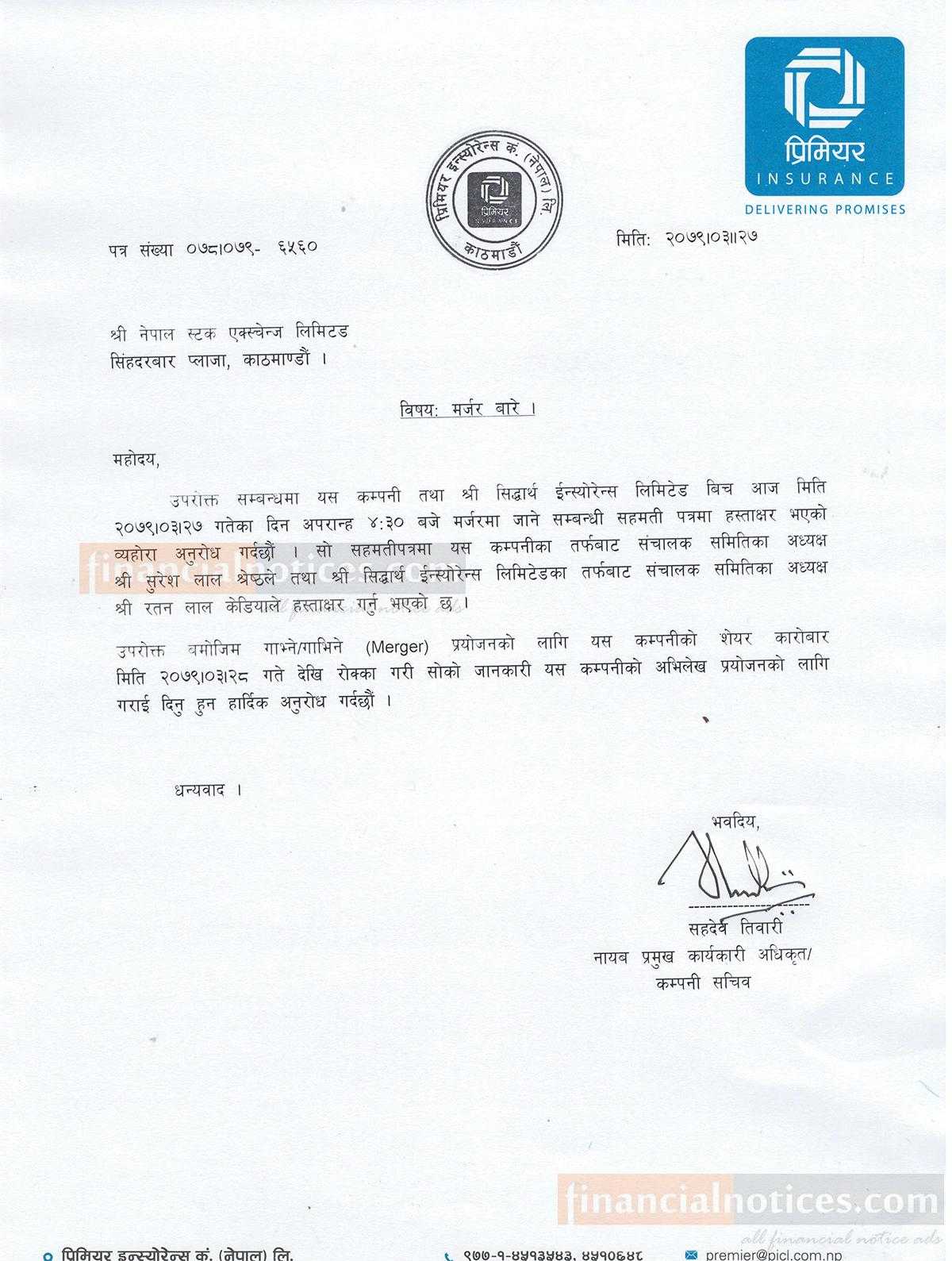 प्रिमियर इस्योरेन्स र सिदार्थ इन्स्योरेन्स बीच मर्जर सम्झौता