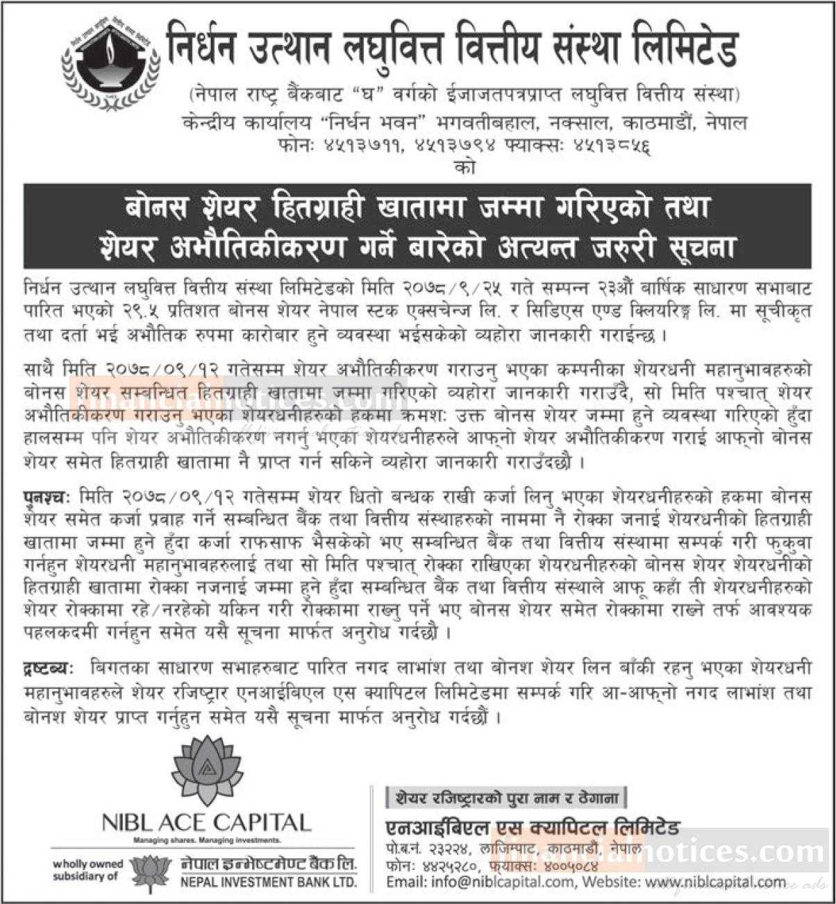बोनस शेयर हितग्राही खातामा जम्मा गरिएको तथा शेयर अभौतिकिकरण गर्ने बारेको सू