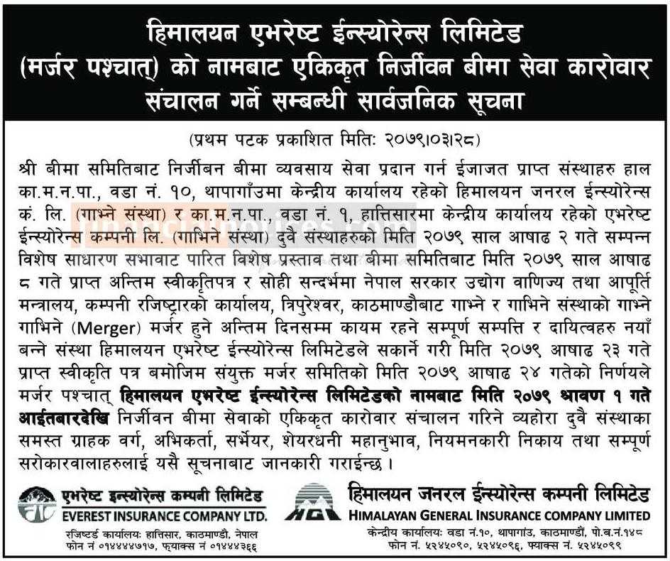 हिमालयन एभरेष्ट इन्स्योरेन्स लिमिटेड (मर्जर पश्चात्) को नामबाट एकिकृत कारोबार गर्ने सम्बन्धी सूचना