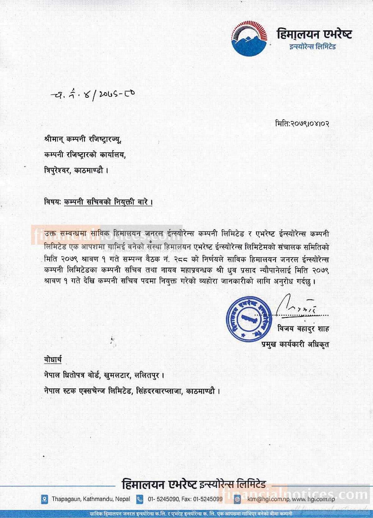 हिमालयन एभरेष्ट इन्स्योरेन्सको कम्पनी सचिवमा ध्रुव प्रसाद न्यौपाने नियुक्ति गरिएकोसम्बन्धी सूचना