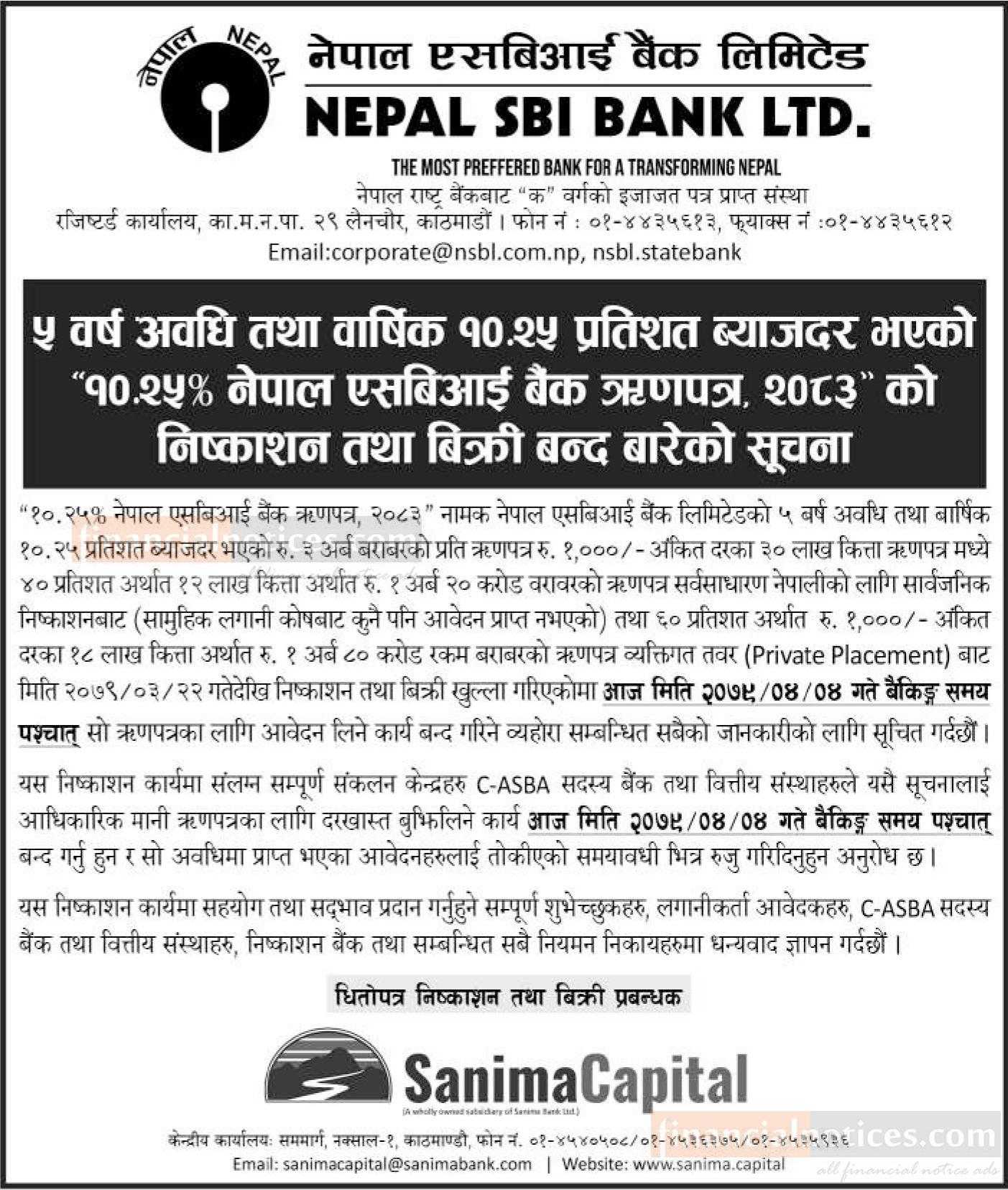 नेपाल एसबिआई बैंकको ऋणपत्रमा आवेदन दिने आज अन्तिम दिन