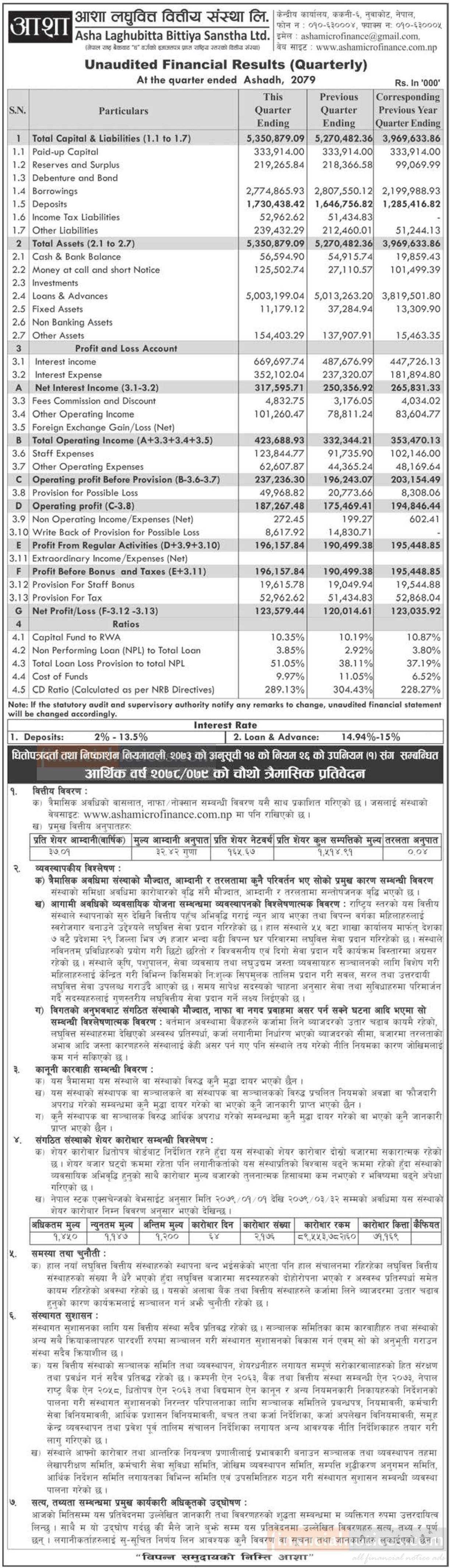 आशा लघुवित्तको खुद नाफा १२ करोड ३५ लाख रुपैयाँ