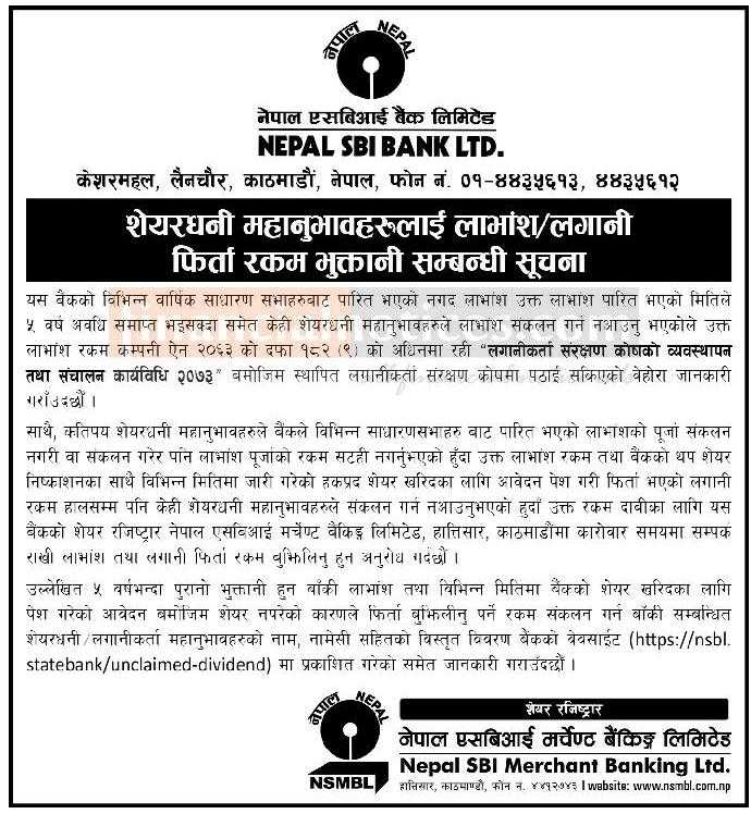 शेयर धनीहरुलाई लाभांश लगानी फिर्ता रकम भुक्तानी सम्बन्धी सूचना