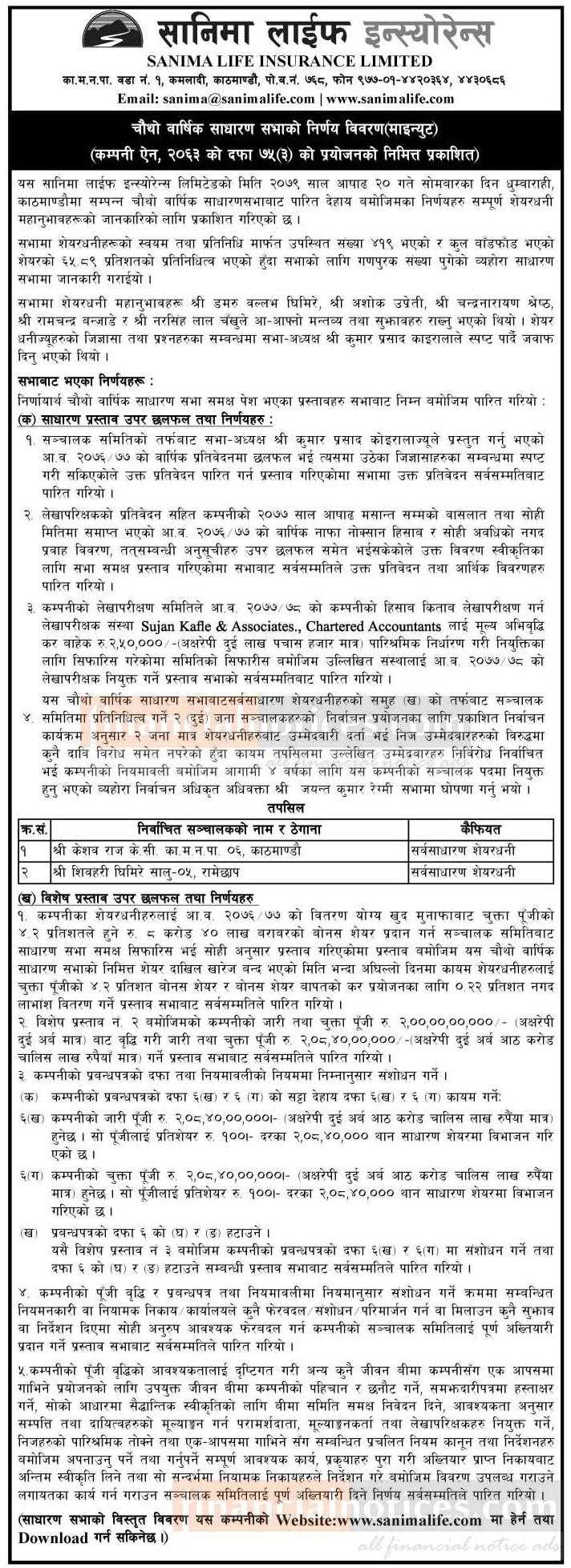 सानिमा लाईफ इन्स्योरेन्सको चौथो वार्षिक साधारण सभाको निर्णय विवरणबारे सूचना