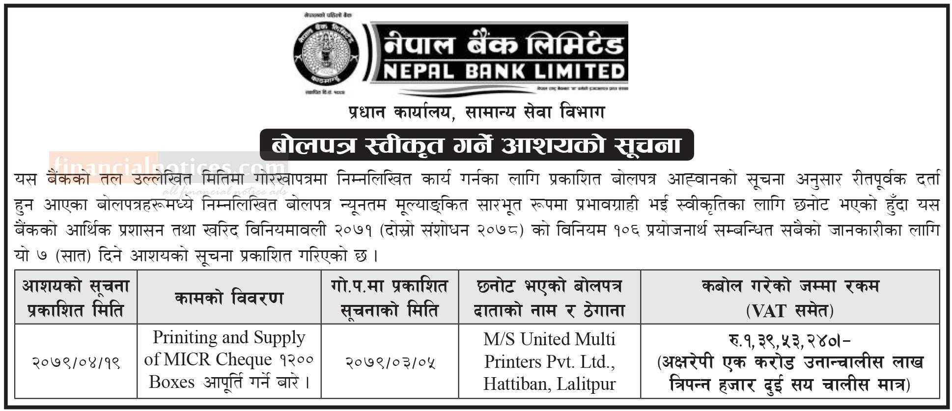 बोलपत्र स्वीकृत गर्ने आशयको सूचना