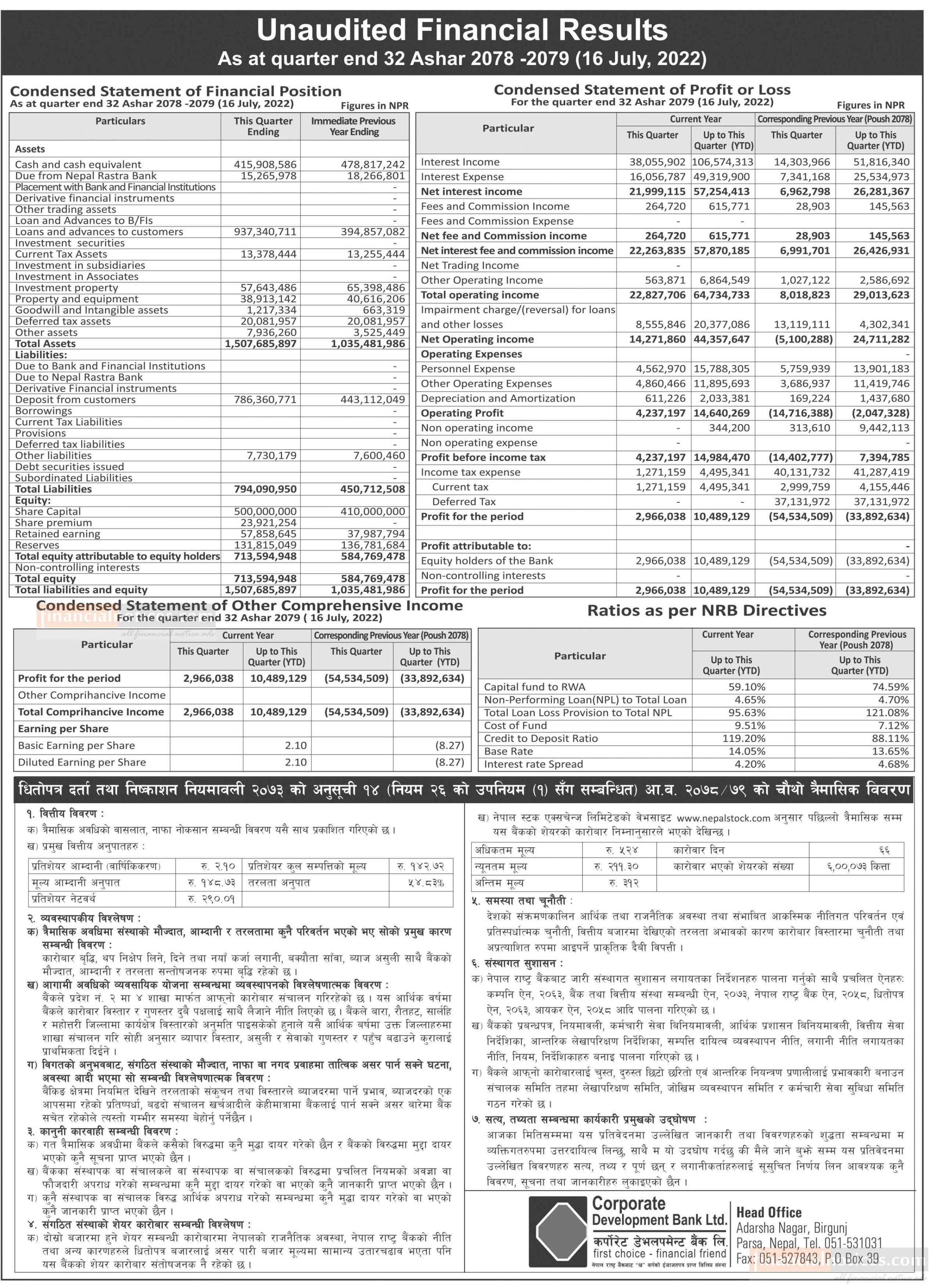 Corporate Development Bank has posted a net profit of Rs 10.48 million.