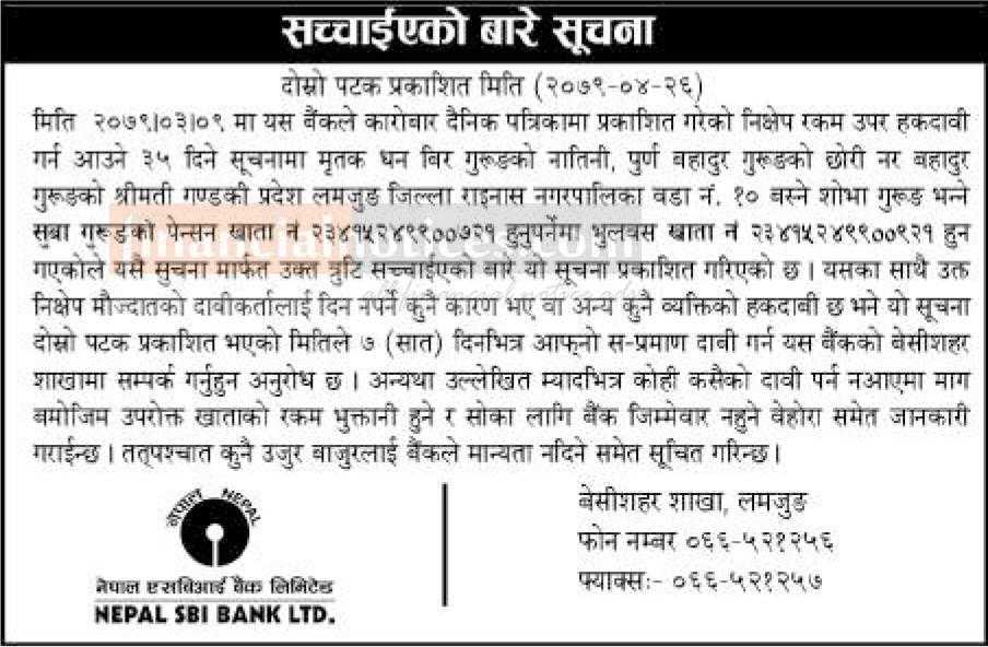 Nepal SBI Bank: Auction Notice for Non-Banking Assets at Geta-2, Kailali
